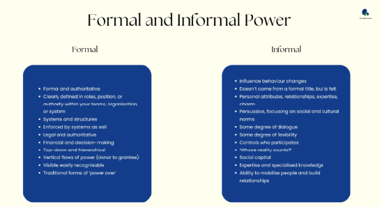 In my JEDI trainings, we discuss power a lot and especially the ways it manifests in both hidden and explicit ways. This is a simple comparison of the ways formal and informal power may be present in your life, team, or organisation. Identifying what it is, how it presents itself, and how it can be addressed are essential first steps in confronting and then challenging our ways of working.